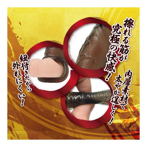 紐が付いていますので、タマに掛ければがっちりキープ。激しいプレイでも抜けることはありません。贅沢な肉厚仕様だから、装着後は太やか逞しいメンズボディに。伸びる素材なので装着もカンタン、フィット感もバツグンです。メンズ自身のパワーアップはもちろん、バイブレーターやディルドなどのラブグッズに装着してもお楽しみいただけます。